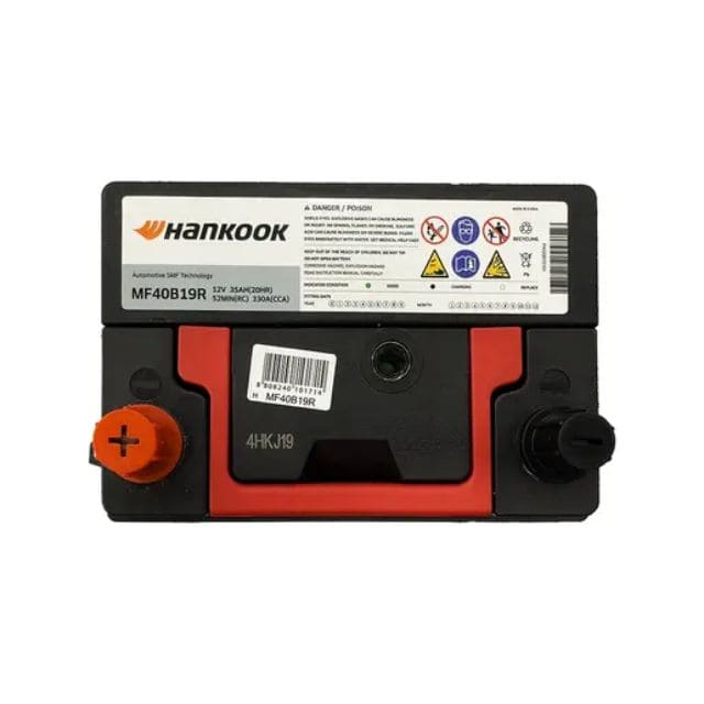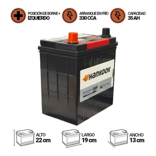 Batería de auto HANKOOK MF40B19R de 35AH y 330CCA es uno de los elementos imprescindibles en todo vehículo. Cumple la función de almacenar la energía eléctrica para luego ser transmitida al motor de partida cada vez que quieras arrancar. Nuestro producto es una batería húmeda rellena de ácido, sellada y 100% libre de mantención. También cuenta con tecnología ”X-Frame”, la que otorga un alto rendimiento optimizando el flujo eléctrico interno de la batería junto con aumentar la durabilidad, haciéndola más resistente contra las vibraciones del motor.Sus 330 CCA hacen de esta la mejor opción de compra a la hora de elegir una nueva batería para tu automóvil.