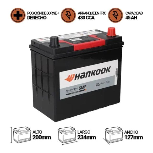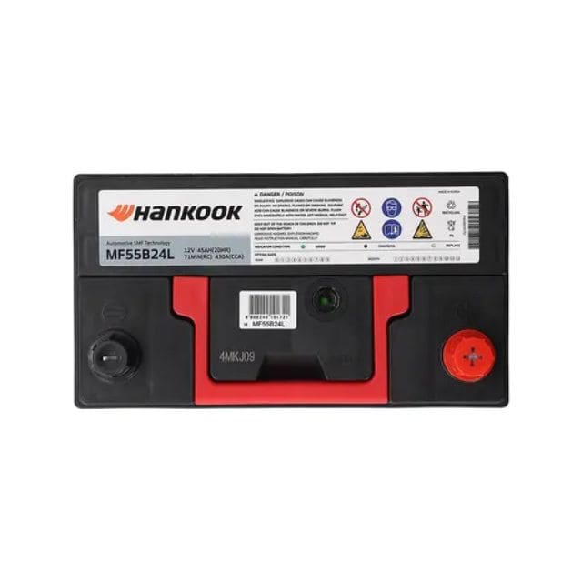Batería de auto HANKOOK MF55B24L de 45AH y 430CCA es uno de los elementos imprescindibles en todo vehículo. Cumple la función de almacenar la energía eléctrica para luego ser transmitida al motor de partida cada vez que quieras arrancar. Nuestro producto es una batería húmeda rellena de ácido, sellada y 100% libre de mantención. También cuenta con tecnología ”X-Frame”, la que otorga un alto rendimiento optimizando el flujo eléctrico interno de la batería junto con aumentar la durabilidad, haciéndola más resistente contra las vibraciones del motor. Sus 430CCA hacen de esta la mejor opción de compra a la hora de elegir una nueva batería para tu automóvil.