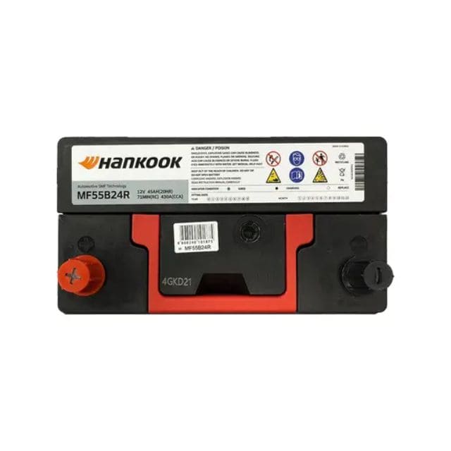 Batería de auto HANKOOK MF55B24R de 45AH y 430CCA es uno de los elementos imprescindibles en todo vehículo. Cumple la función de almacenar la energía eléctrica para luego ser transmitida al motor de partida cada vez que quieras arrancar. Nuestro producto es una batería húmeda, rellena de ácido, sellada y 100% libre de mantención. Además, cuenta con tecnología ”X-Frame”, la que le otorga un alto rendimiento optimizando el flujo eléctrico interno de la batería y además aumenta la durabilidad, haciéndola más resistente contra las vibraciones del motor. Sus 430 CCA hacen de esta la mejor opción de compra a la hora de elegir una nueva batería para tu automóvil.