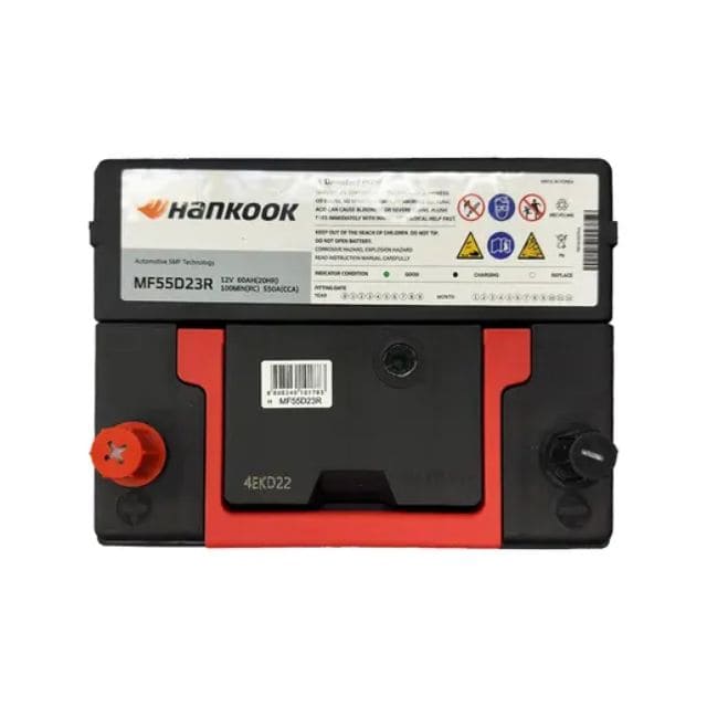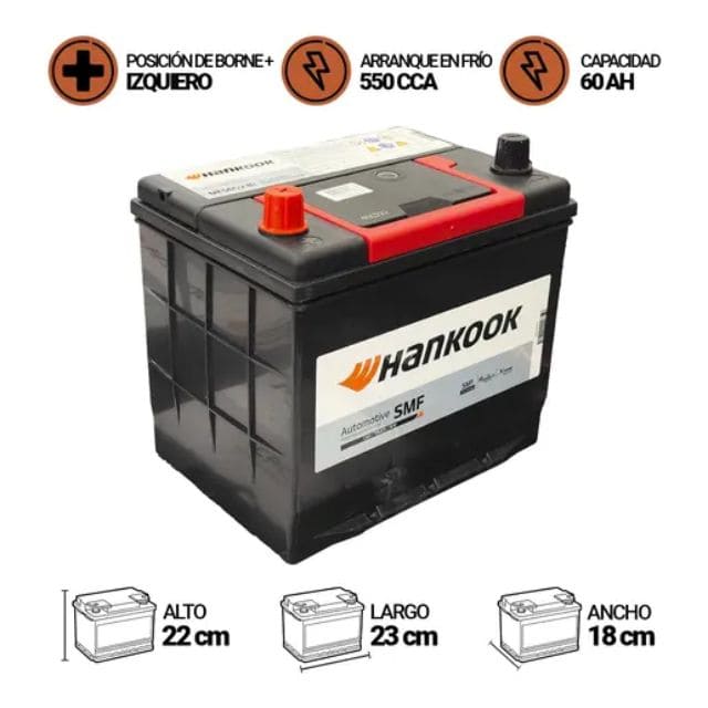 Batería de auto HANKOOK MF55D23R de 60AH y 550CCA es uno de los elementos imprescindibles en todo vehículo. Cumple la función de almacenar la energía eléctrica para luego ser transmitida al motor de partida cada vez que quieras arrancar. Nuestro producto es una batería húmeda rellena de ácido, sellada y 100% libre de mantención. También cuenta con tecnología ”X-Frame”, la que otorga un alto rendimiento optimizando el flujo eléctrico interno de la batería junto con aumentar la durabilidad, haciéndola más resistente contra las vibraciones del motor.Sus 550CCA hacen de esta la mejor opción de compra a la hora de elegir una nueva batería para tu automóvil.