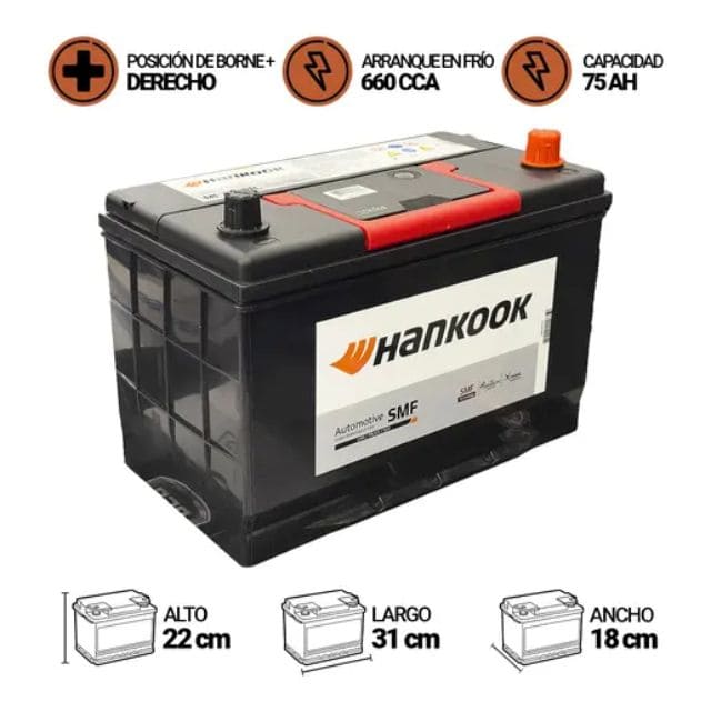 Batería de auto HANKOOK MF75D31L de 75AH y 660CCA es uno de los elementos imprescindibles en todo vehículo. Cumple la función de almacenar la energía eléctrica para luego ser transmitida al motor de partida cada vez que quieras arrancar. Nuestro producto es una batería húmeda rellena de ácido, sellada y 100% libre de mantención. También cuenta con tecnología ”X-Frame”, la que otorga un alto rendimiento optimizando el flujo eléctrico interno de la batería junto con aumentar la durabilidad, haciéndola más resistente contra las vibraciones del motor.Sus 660 CCA hacen de esta la mejor opción de compra a la hora de elegir una nueva batería para tu automóvil.