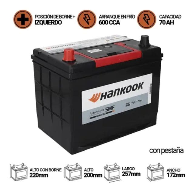 Batería de auto HANKOOK MF80D26R de 70AH y 600CCA es uno de los elementos imprescindibles en todo vehículo. Cumple la función de almacenar la energía eléctrica para luego ser transmitida al motor de partida cada vez que quieras arrancar. Nuestro producto es una batería húmeda rellena de ácido, sellada y 100% libre de mantención. También cuenta con tecnología ”X-Frame”, la que otorga un alto rendimiento optimizando el flujo eléctrico interno de la batería junto con aumentar la durabilidad, haciéndola más resistente contra las vibraciones del motor.Sus 600 CCA hacen de esta la mejor opción de compra a la hora de elegir una nueva batería para tu automóvil.