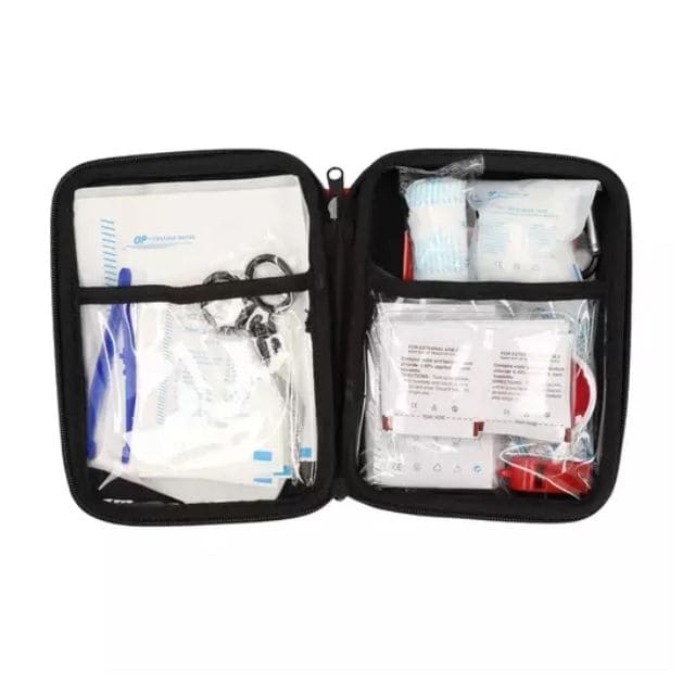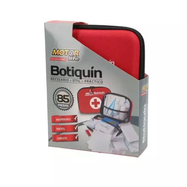 Botiquín MotorLife 85 piezas es un producto completo para ayudarte en caso de cualquier accidente o emergencias. Su empaque práctico, compacto y liviano lo hace ideal para mantener dentro del vehículo ante cualquier eventualidad. Este botiquín contiene guía de primeros auxilios, tijeras, pinzas, mosquetón, silbato para emergencias, rollo de gasa, venda triangular, cinta adhesiva, venda multiuso, vendaje adhesivo para nudillos, apósito de gasa estéril talla L, 2 apósitos de gasa estéril talla M, 4 apósitos de gasa estéril talla S, 2 guantes de vinilo (1 par), 2 vendajes adhesivos para codo/rodilla, 3 toallas para el alivio de picaduras, 6 toallas antisépticas sin alcohol, 14 toallas desinfectante con alcohol, 10 vendajes adhesivos estándar, 10 vendajes adhesivos tipo mariposa, 20 vendajes adhesivos pequeños y 1 estuche rígido.